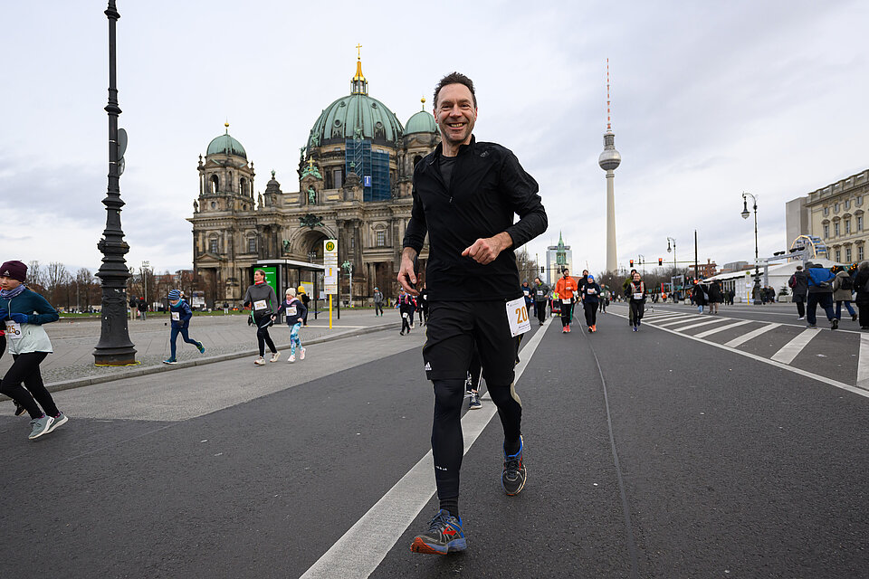After securing his well-deserved medal in the 10-kilometre Berlin New Year's Eve Run, 17-time Tour de France participant Jens Voigt also took part in the Berlin New Year's Run – but not before making his donation to the Björn Schulz Foundation. Alongside him, over 4,000 participants enjoyed the relaxed running pace without any time pressure at the start of the year.